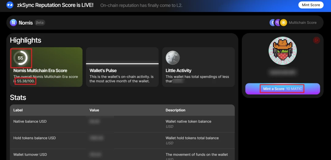 3. 操作最简单、最省钱的非 Nomis 莫属。 无需用户完成各种任务,只需要在链上多操作,多存钱,多买 NFT,就可以提高综合分数。