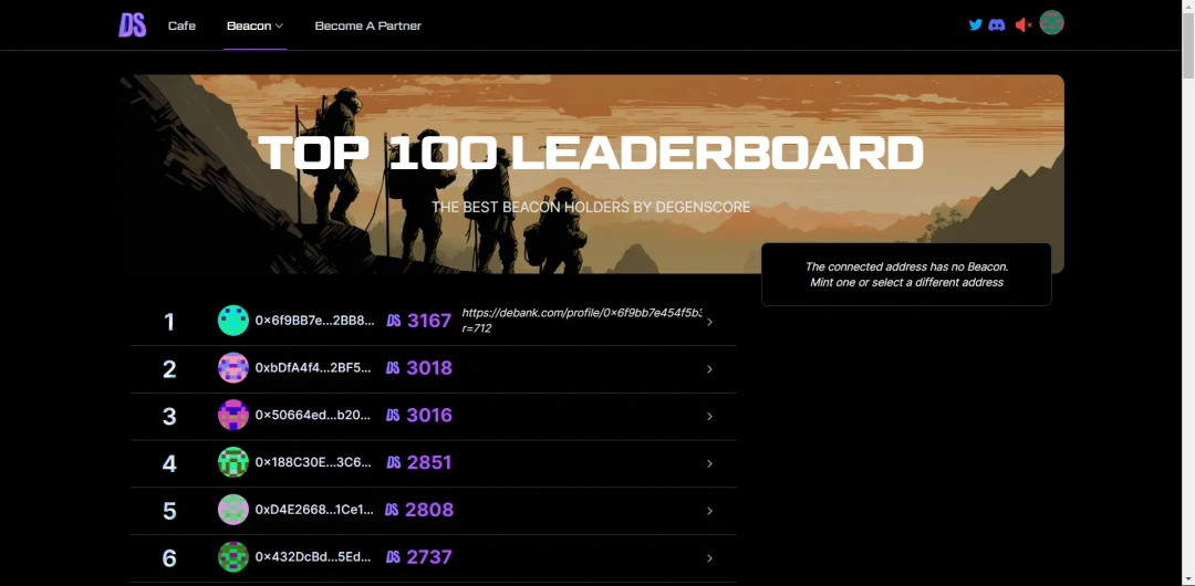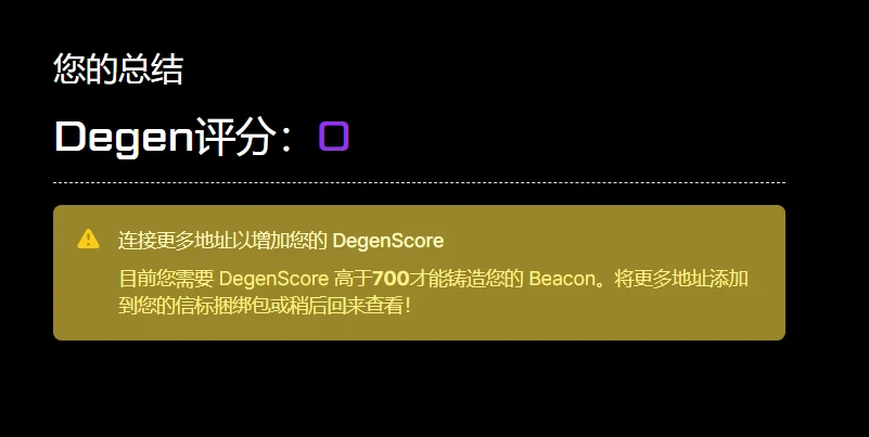 超过 700 分的用户,可以 mint 一个 Degenscore Beacon 的 SBT,但是要想达到 700 分,这可不容易。