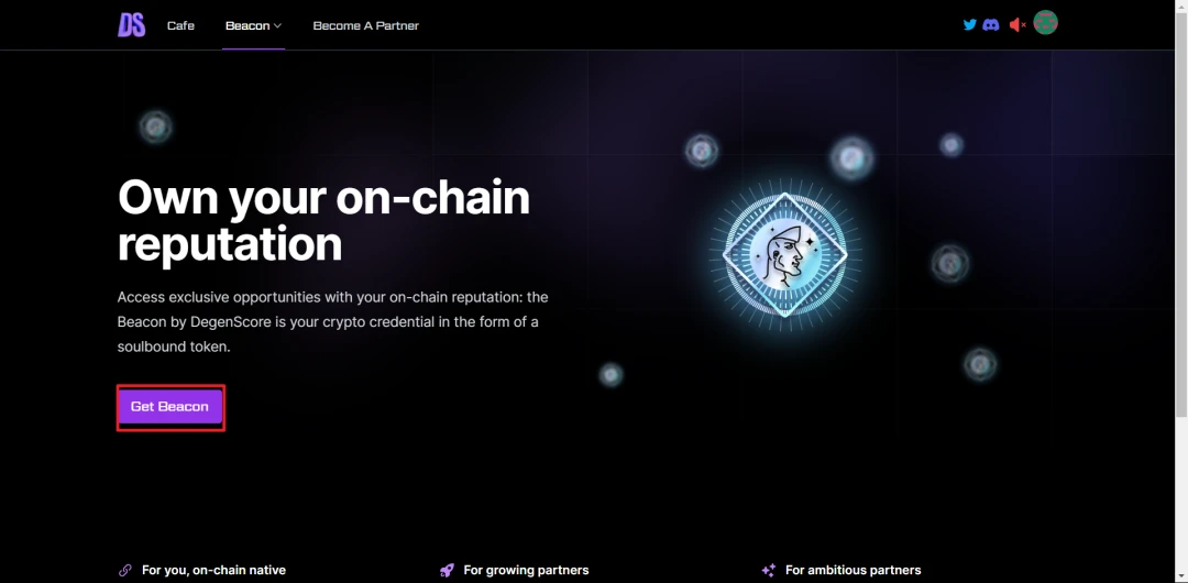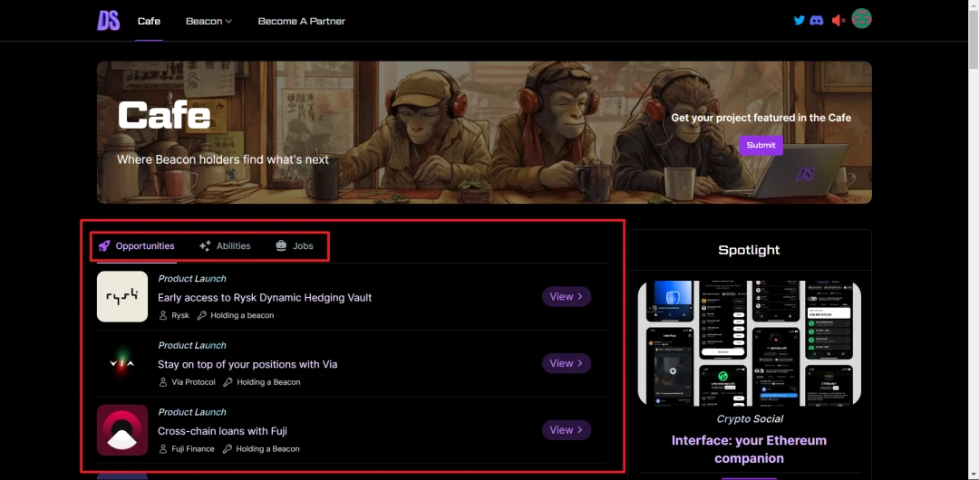 Degenscore 的官网一打开,出现的是 Cafe 界面。这里包含了 Opportunities、Abilities 以及 Jobs 三个部分,开门见山地告诉用户持有 Beacon 有什么好处。