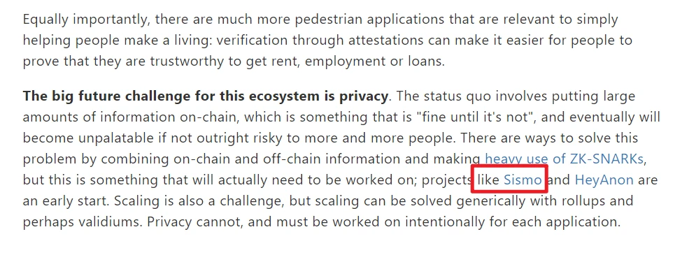 这对于一些想要展现实力,但是又害怕泄露隐私的用户是极有吸引力的。比如以太坊的创始人 Vitalik 就曾在其博客中提到,自己十分看好身份生态系统,并举例进行说明,Sismo 就是他特别提到的一个项目。