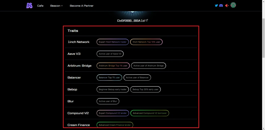 Degenscore 是一个基于链上行为的去中心化身份系统,它不像上面的 Nomis 支持多链,Degenscore 的分数全部由以太坊主网上的行为构成。