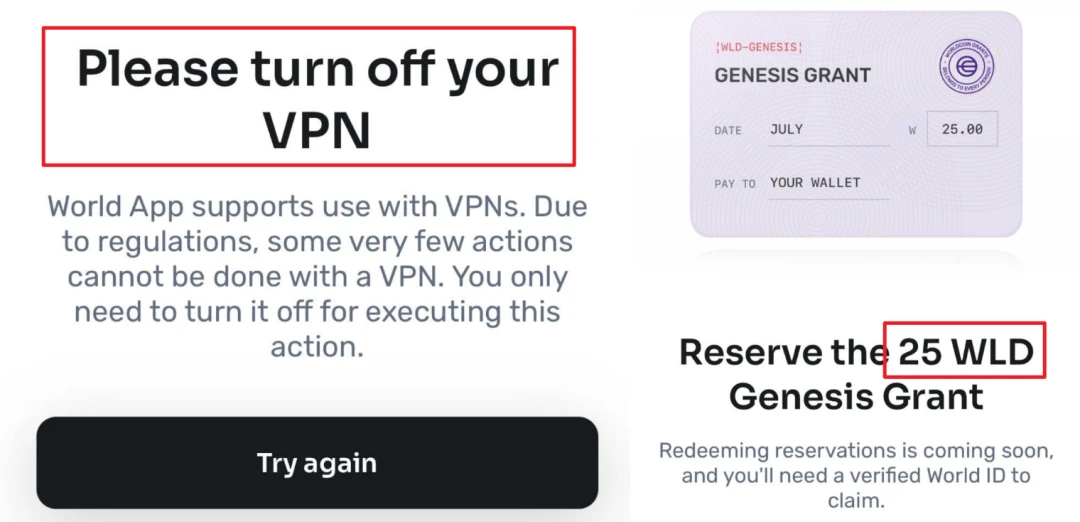 这里如果立刻进行验证,需要你关闭 VPN,验证完后会发放 25 个 $WLD 代币给你。