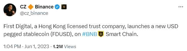 值得注意的是,Binance 创始人 CZ 也在 FDUSD 推出的第一时间发布了相关推文。