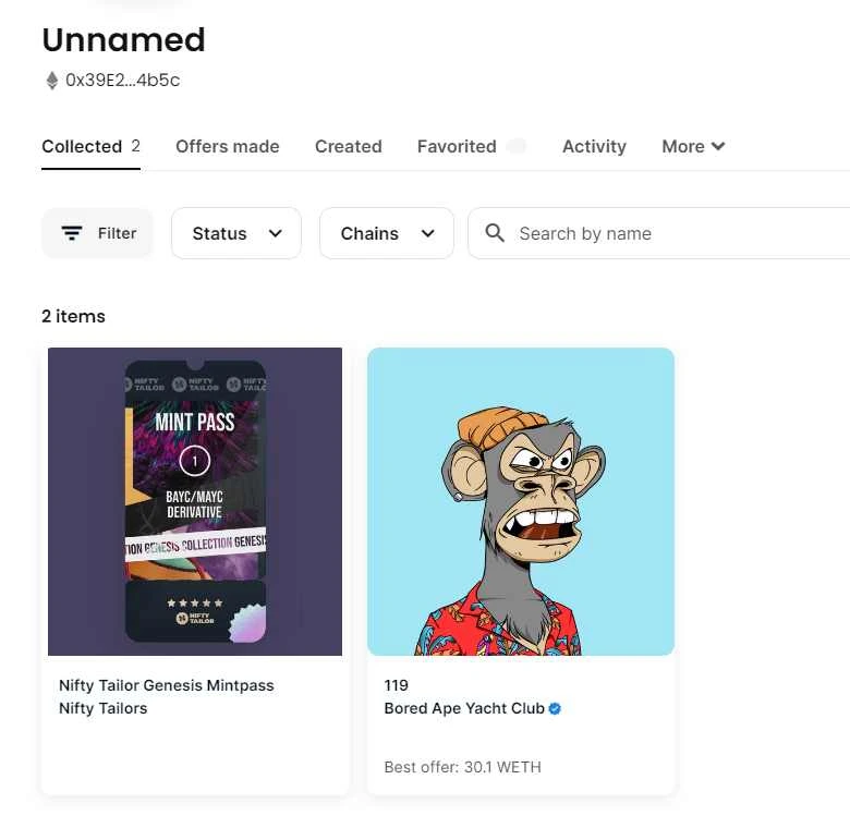 查看 Vincent Chok 的推特主页,BlockBeats 发现 Vincent 也是一枚 BAYC 持有者,旋即根据其 NFT 头像找到了以太坊地址:0x39E298800356ca0b973A50bF34A977D2B01d4b5c。