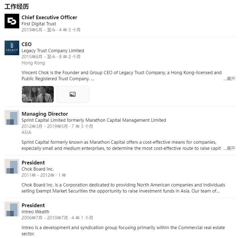 公开信息显示 First Digital 的首席执行官为 Vincent Chok。据 Linkedin 信息显示,除去在 First Digital 担任 CEO 之外,Vincent Chok 自 2015 年起就一直在 First Digital 母公司 Legacy Trust Company Limited 担任 CEO,而 First Digital 现任 COO Gunnar Jaerv 此前也曾在 Legacy Trust Company Limited 先后担任自有品牌信托负责人以及数字资产部门负责人一职,在该公司工作长达 7 年时间。