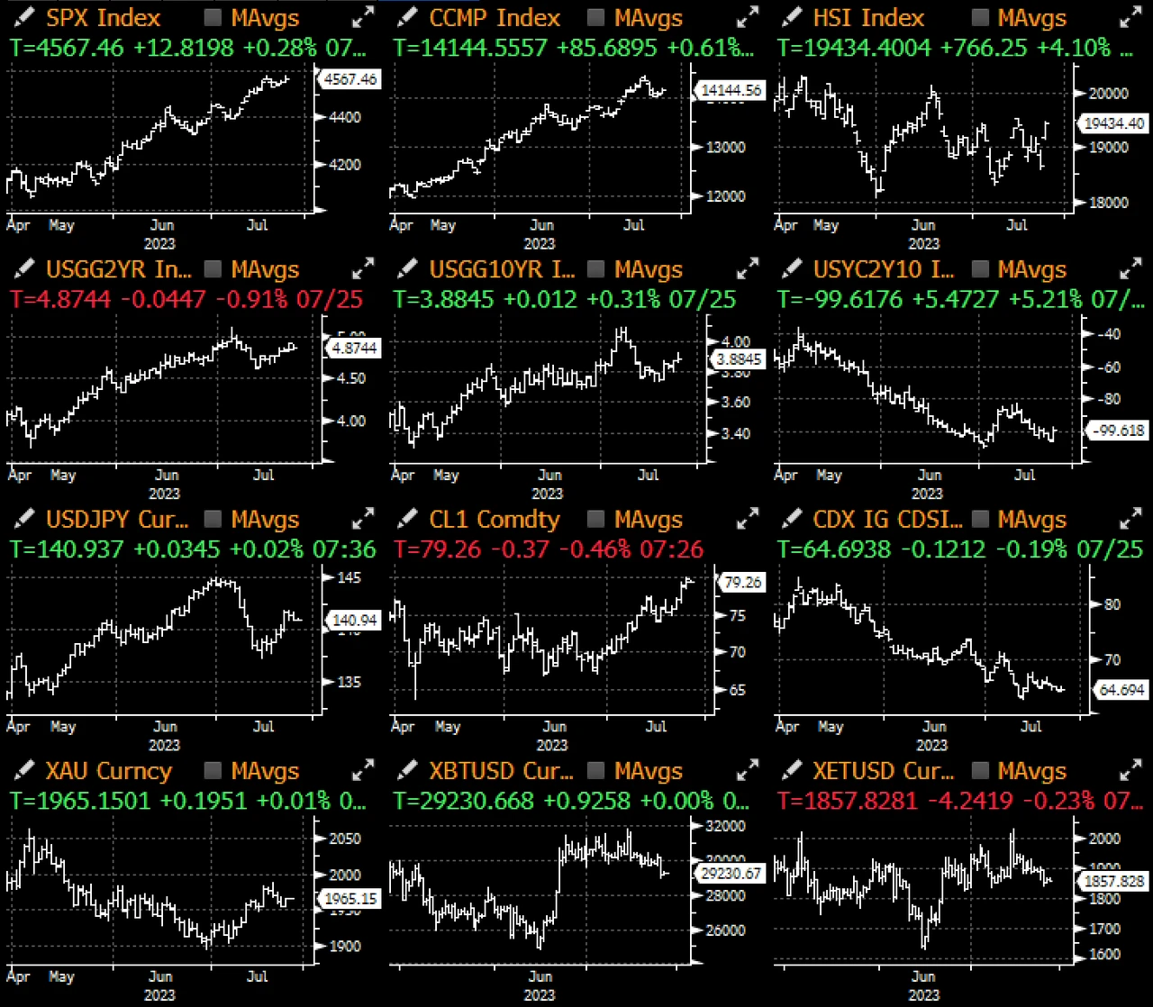 目前为止的企业盈利结果相较于高市场预期好坏参半,不过大部分仍显示出增长( Alphabet 高于预期,而 Microsoft 则令人失望), 市场将在今晚迎来 FOMC 会议,当前市场预期基本偏向鸽派,预计会出现“先加息,然后跳过”的信息 ,这将验证 2024 年将进入降息的市场预期; 交易员也期待 Powell 对近期 CPI 和 PCE 数据走软表示认可 ,这对股市将有正面影响,且像是“通胀仍居高不下”和等待“更多信息积累”这类的说法可能会被删除或用更加鸽派的措辞来取代。最后,针对问答环节,我们预计 Powell 将会重申要对通胀保持警惕的标准论述, 不过他也有可能引导市场进一步远离 9 月加息(目前约 25% 的机率)并淡化美联储点阵图的重要性,比市场预期的更为鸽派;而如果他仍执意关注强劲的就业市场、消费者活动的韧性或是提及宽松的金融形势,可能会被视作比市场预期的更加鹰派。