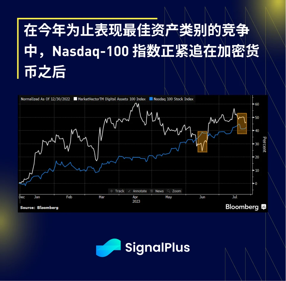 在加密货币方面,仍缺乏新的催化剂来推高价格,且大量的坏消息也已基本被消化,加上美联储加息周期迈入尾声,下行空间也相对有限,基本上在重复过去一周的价格走势,然而,最近的下跌已经危及了加密货币在今年涨幅中的领先地位,由于 Nvidia 和其他科技巨头的飙涨,Nasdaq-100 正紧追在后。
