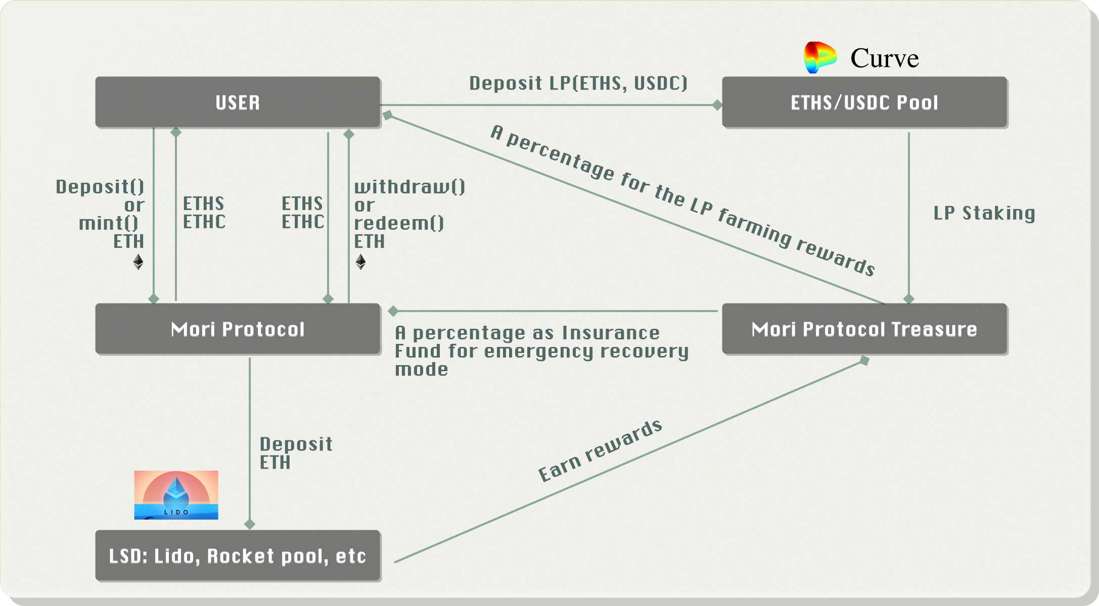 此前也有针对 ETH 为标的的稳定币,比如 LUSD ,但这类稳定币在资本效率和可扩展性方面有着限制,在体量上落后于法币支持的稳定币。Mori Finance 议将 ETH 的波动性分为低波动性稳定资产和高波动性衍生资产。以 ETH 为例,用户可以根据自己的风险偏好选择持有高波动性的 ETHC(ETH Coin)资产和低波动性的 ETHS(ETH Stable)资产。