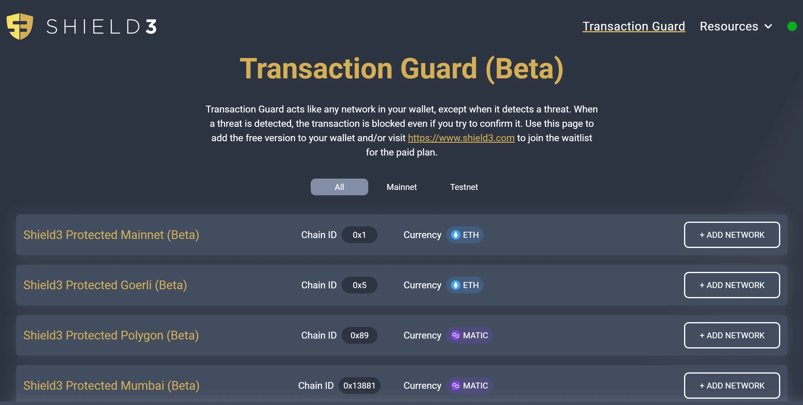 Shield 3 现已上线测试版,支持以太坊主网、 Polygon 两个主网及其测试网。