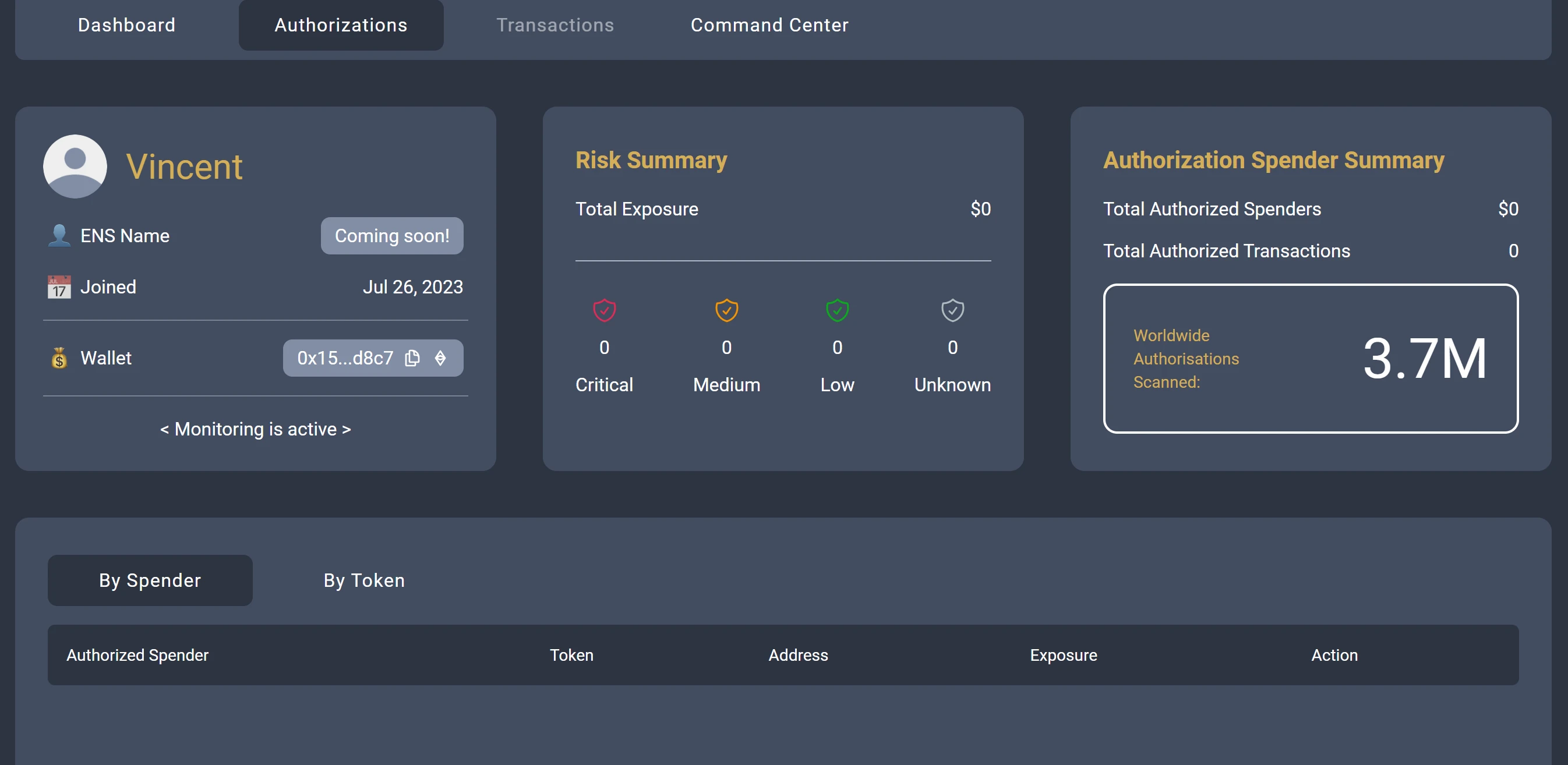 上图是授权后,钱包的 Shield 3 使用情况。从图中可以对风险总结、授权交易次数及金额的统计评级,也可以追溯之前的交易对象等。