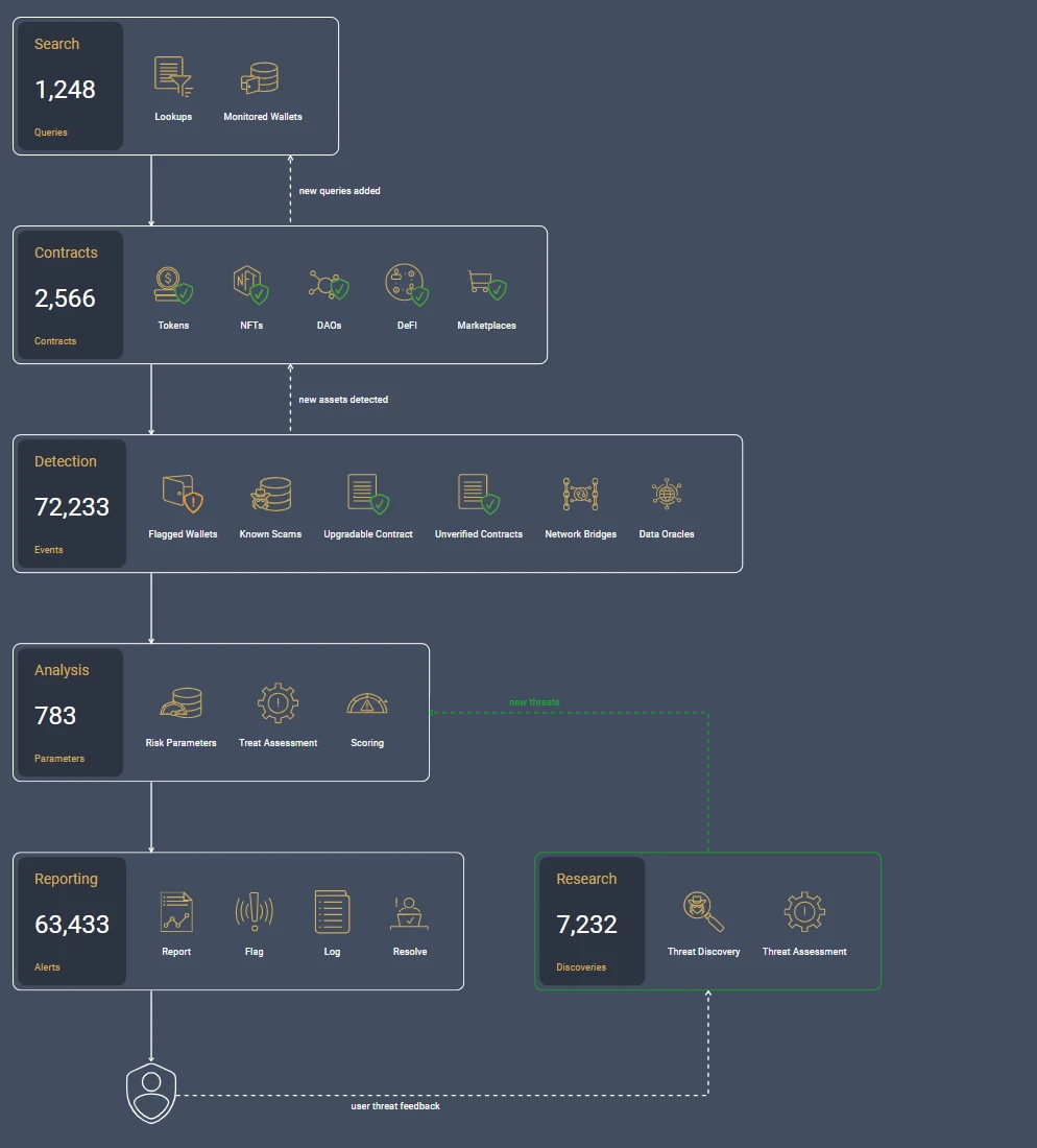 根据上图,可以了解目前 Shield 3 的使用流程,Shield 3 从钱包多方位(搜索、合约、监测、分析、报告、研究)提供安全保障服务。