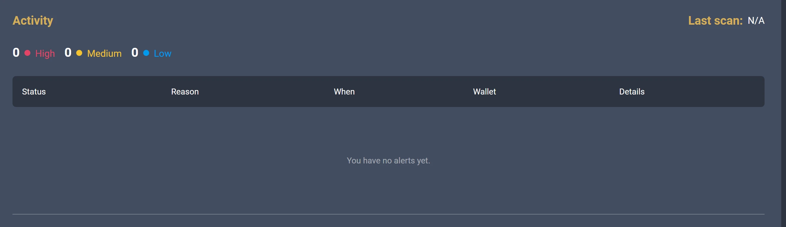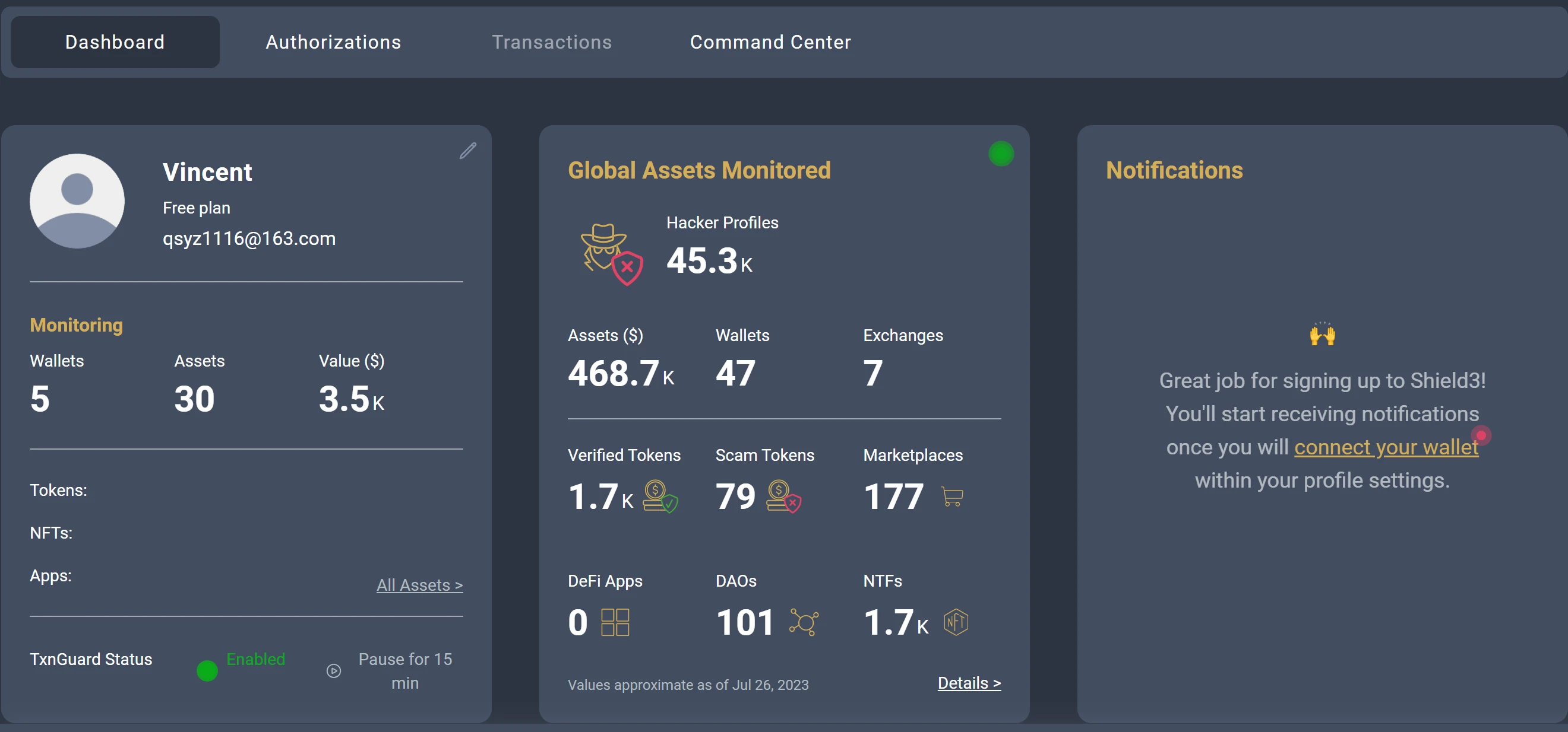 上图是关联账户后的仪表盘,通过仪表盘可以看目前 Shield 3 服务的资金量及监控的黑客地址或攻击手段等。同时该系统会记录钱包的链上活动等。