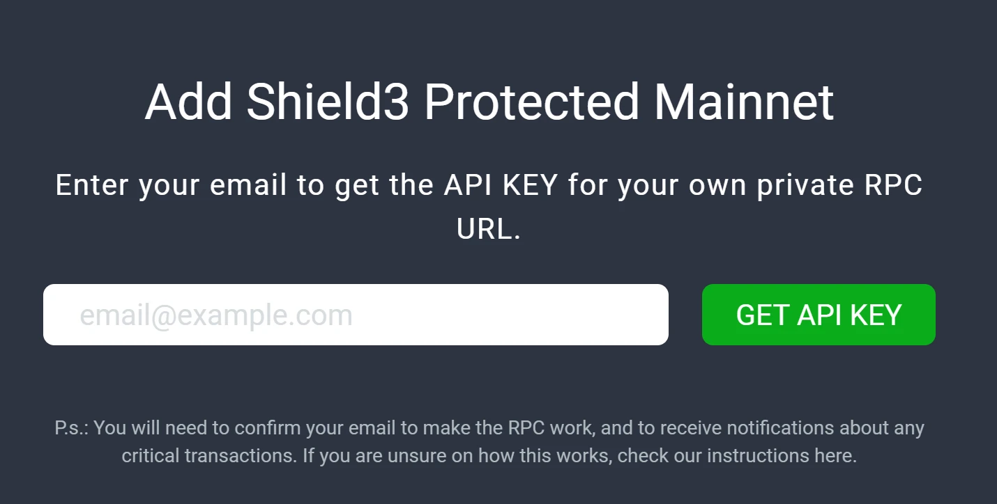 首先,用户要填写邮箱,查收 API KEY,再关联钱包,并添加网络与 Shield 3 连接。具体如下图: