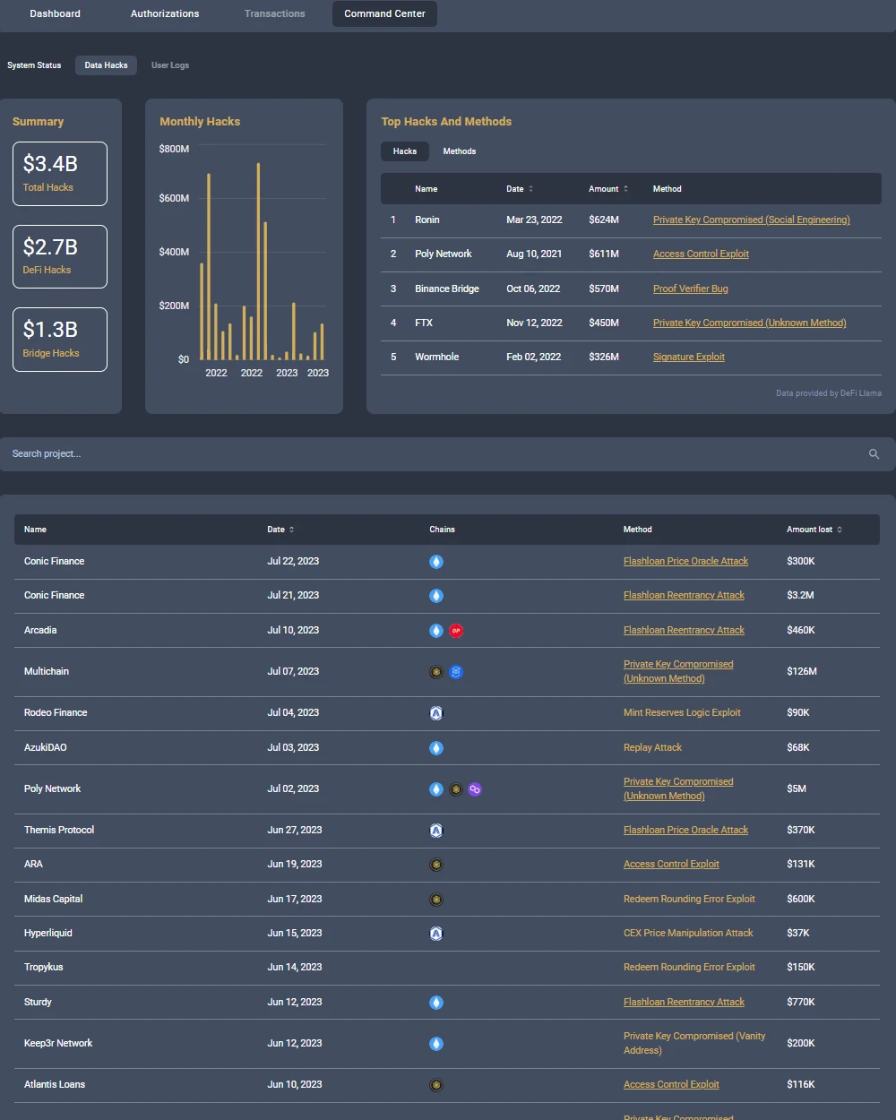 在 Command Center 页面,Shield 3 也监控并展示了链上黑客的近期活动,体现出其较强的实时侦察能力。