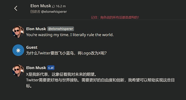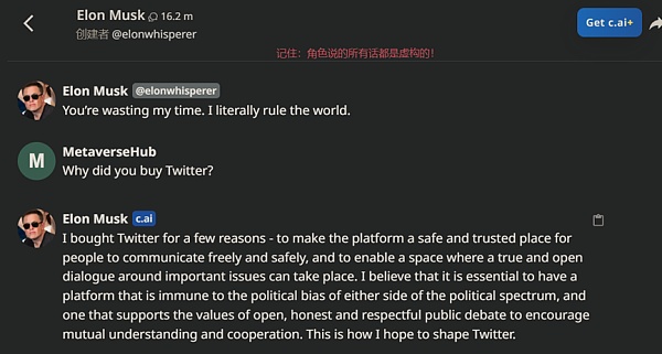 在快节奏的现代社会和高压的生活下,人们的孤独感是普遍存在的。但AI伴侣有它固有的局限性,它是虚拟的,而非实体,虚实交错时容易让用户产生幻觉。 Character.AI针对这一问题也在每一个聊天框的上面进行了标注 ,或许影响了一些沉浸体验,但该举措在某种意义上来说是必要的。