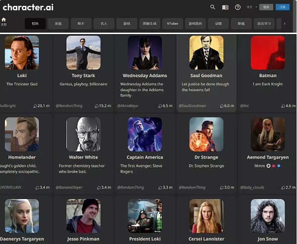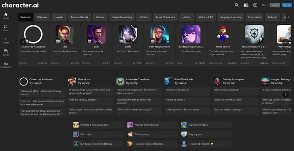 Character.AI网站主页上提供了各式各样的聊天机器人,页面顶部的角色类别包括: