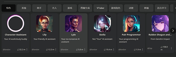 UGC是指用户自主创作或分享的内容,Character.AI让用户可以创造个性化的AI对话机器人。而发展UGC可以极大丰富AI聊天机器人的内容,拓宽对话的深度与广度,也可以增加用户的参与度和归属感。平台目前已经积累了上千万个聊天机器人,并根据类型进行了区分,从网红博主到影视动漫人物,应有尽有,其中大部分都来自用户用爱发电创作。