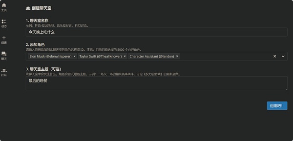 除了创建角色,你也可以创建聊天房间,邀请多个角色或其他用户加入群聊。这种模式既可以增加对话的趣味性和多样性,也可以让用户结识更多的朋友。 群聊模式是Character.AI的独有模式 ,用户可以看到不同角色之间的互动和碰撞,甚至可能产生意想不到的“火花”。