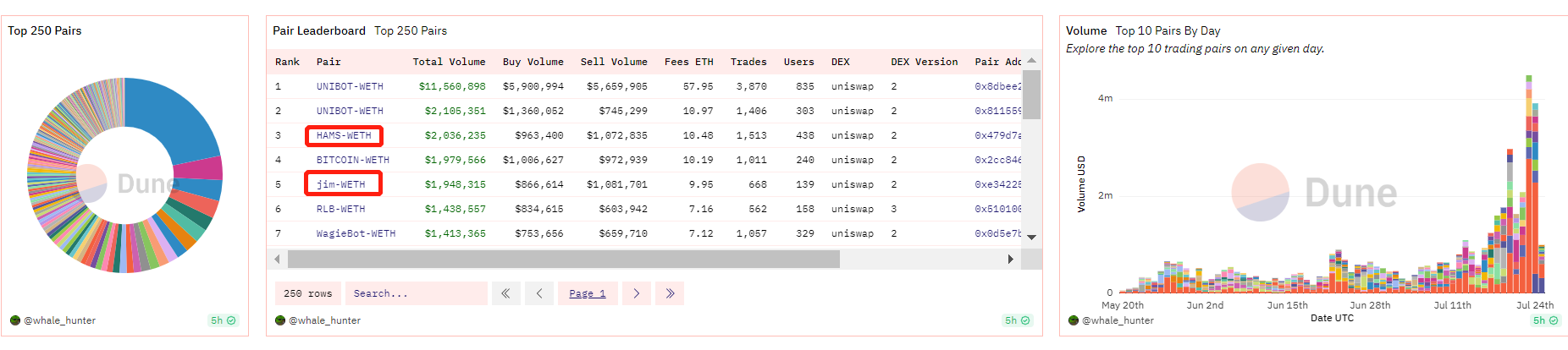另外,Unibot 完成的大部分交易量主要依靠是自身代币 UNIBOT-WETH。交易币种最多的为 memecpin 代币,如排名第三的为链上仓鼠竞赛游戏代币 HAMS、其次是猿类动物币 JIM。如果 memecoin 热度不再,Unibot 交易量该如何维持?