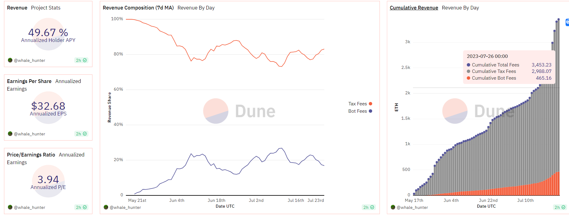 根据 Dune 数据显示,目前 Unibot 捕获的 3280 ETH 收入中,其中有 2843 ETH 是来源于 UNIBOT 代币交易税,依靠机器人交易业务的收入仅有 437.2 ETH(约 81 万美元)。即 Unibot 收入的 80% 以上是来源于 UNIBOT 代币交易税,仅有不到的 20% 是来源于主打的机器人交易业务。