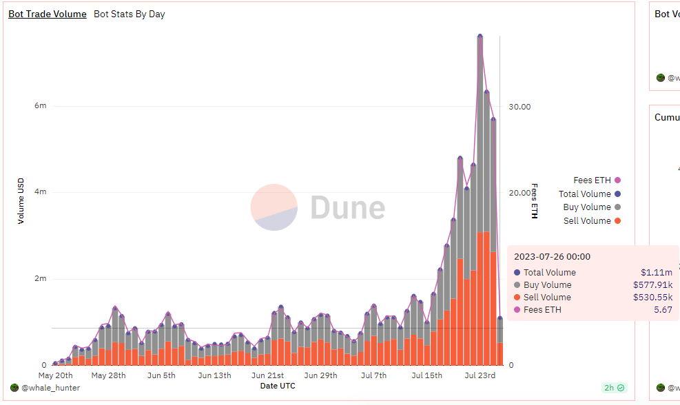 其实,Unibot 交易量已大幅下降, 7 月 26 日交易量仅有 110 万美元,捕获的费用为 2.2 万美元。