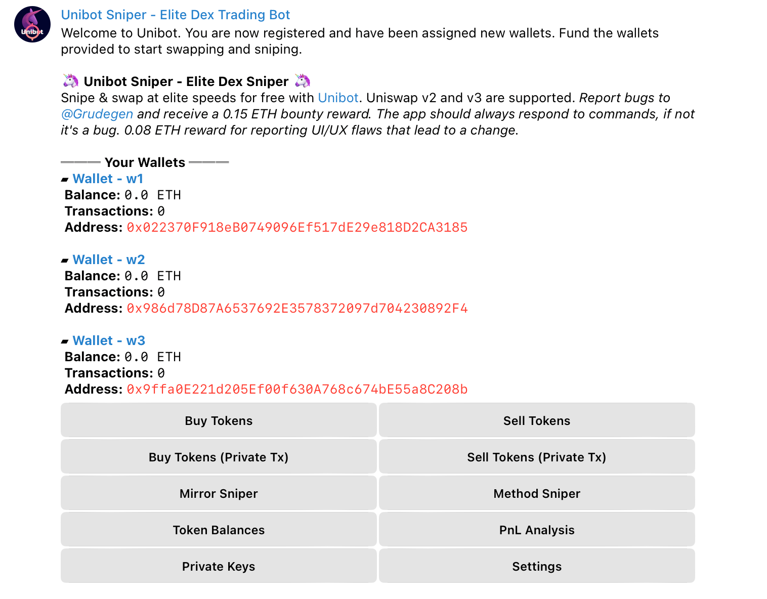 因此,用户在使用 Unibot 等机器人时需要有风险意识,最好放入少量资金和使用新钱包。