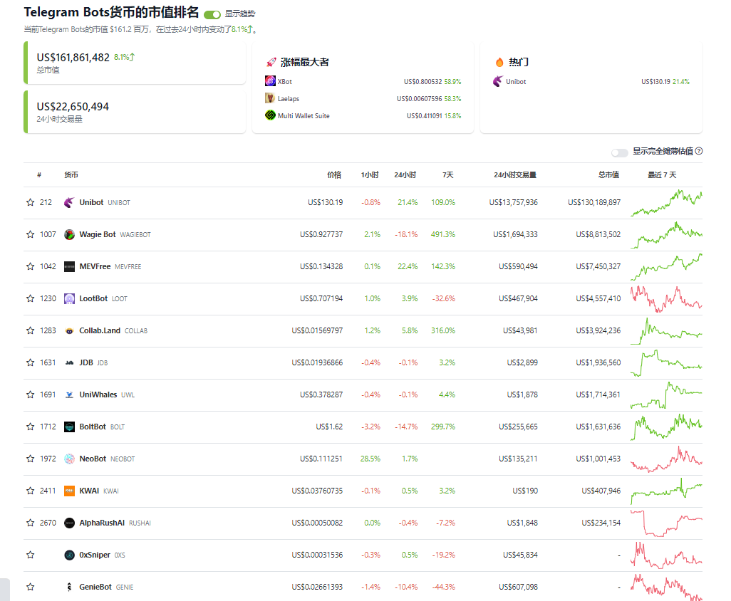 上周, Huobi 、 Bitget 等交易所就上线 UNIBOT 代币,CoinGecko、CoinMarketCap 等加密数据平台也纷纷上线了 Telegram Bot 板块代币。