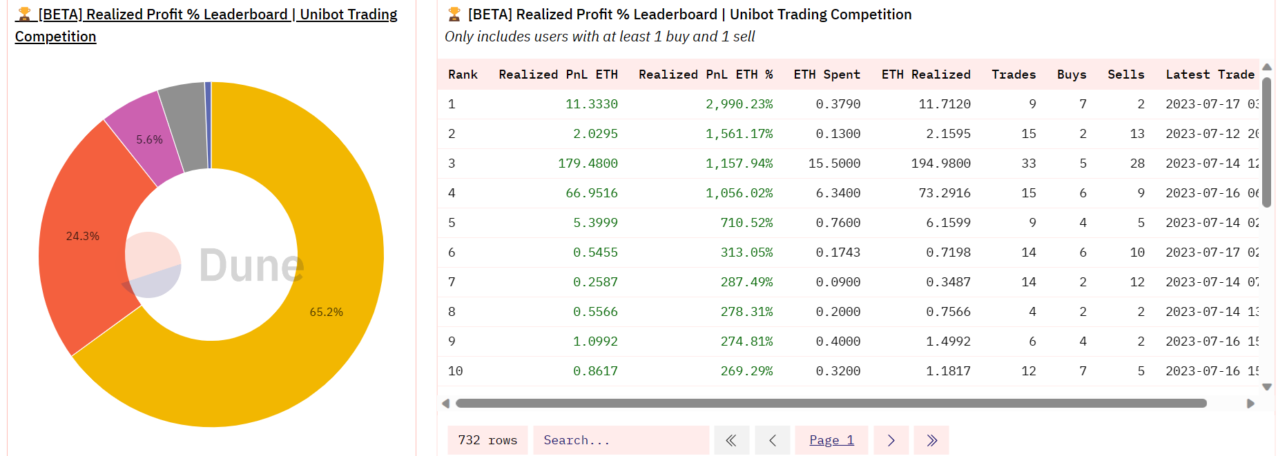 此外,数据显示 Unibot 捕获费用的 80% 以上其实都是来源于原生代币 UNIBOT 的交易税收(用户每完成一笔 UNIBOT 代币交易需要支付 5% 交易税),仅有不到 20% 的收入是来源于其宣称的交易手续费。而 Unibot 交易机器人完成的交易币种多为 memecoin。在 7 月份举办的 Unibot 交易大赛中,一千多名参赛链上地址中约有 65% 以上的是处于亏损状态。