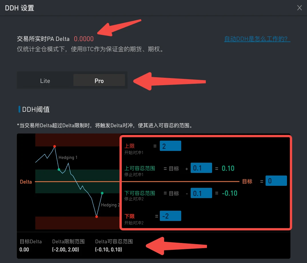 在设置界面中,顶部数字显示的是从交易所获取的您账户的实时 Delta,Delta 的刷新频率小于 5 秒。我们建议使用 Pro 模式,以便实现更多自定义设置。