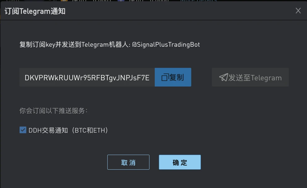 订阅通知首先需要点击页面右上角 Telegram 图标。然后点击 “发送至 Telegram” 按钮并将订阅密钥粘贴到您与 @SignalPlusTradingBot 的聊天框中,机器人会回复 “Subscribed” 作为订阅成功的标志。