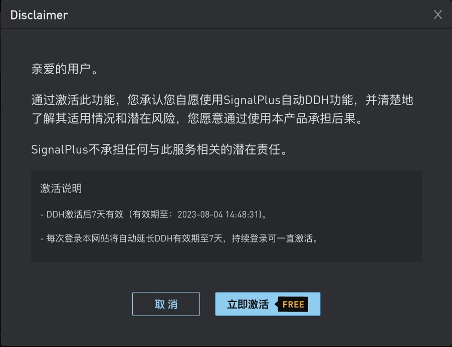 点击【开启自动 DDH】按钮后,请仔细阅读免责声明,如果您对此无异议,即可点击立即激活使用该功能。 需要注意的是,如果您 7 天内未登录帐户,该功能将会自动关闭。