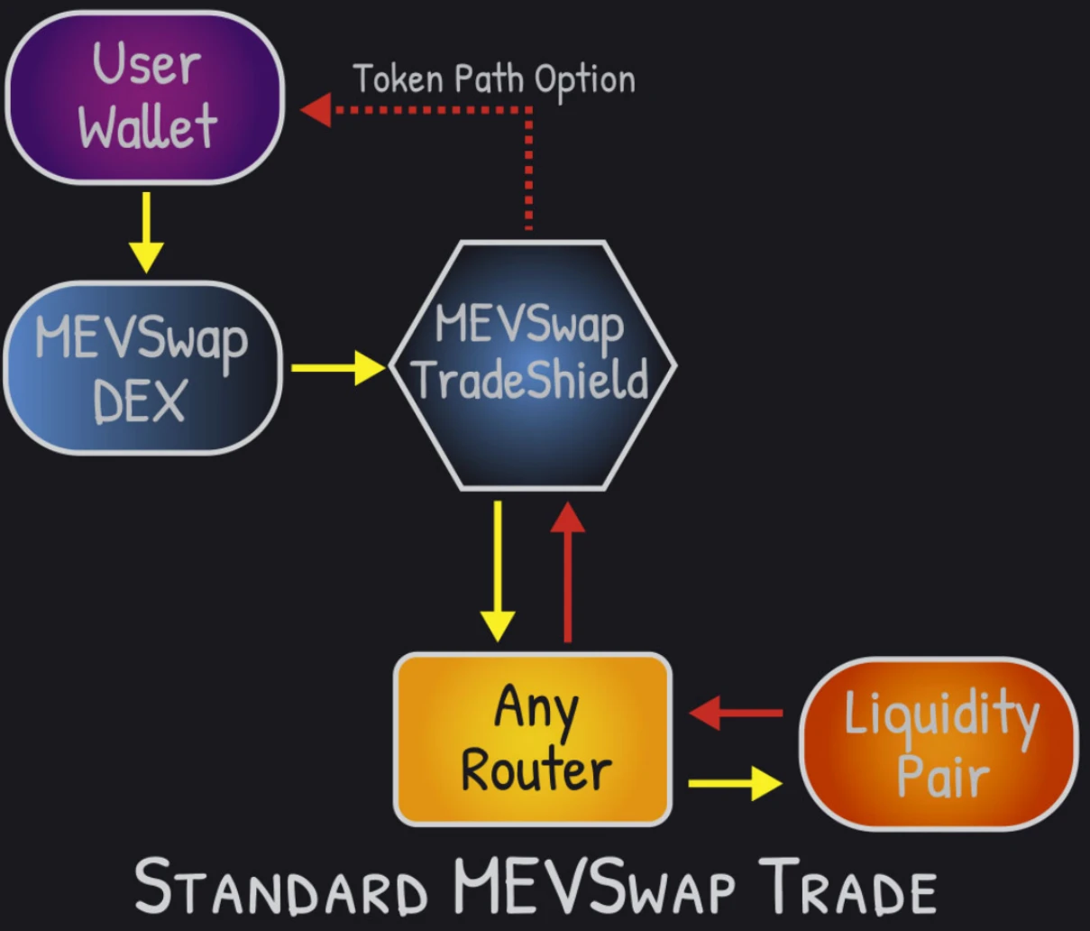MEVSwap 的最核心的功能是 TradeShield 保护机制,通过在智能合约内执行交易和安全存储代币,提供交易隐私和 MEV 保护,最小化税收并增强用户隐私。TradeShield 的运作模式根据下图可以了解: