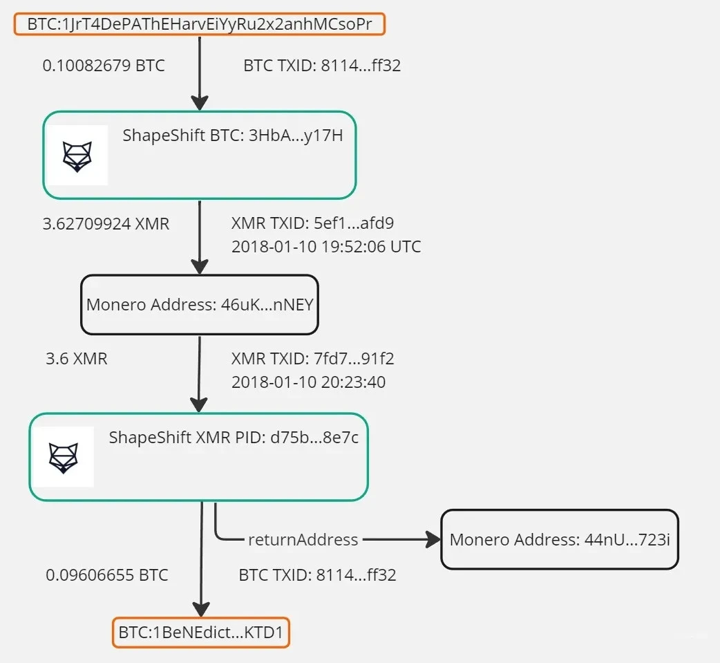 Bax 确定 Schober 所谓的黑客通过 ShapeShift 将从另一名受害者那里窃取的一些 BTC 转换为门罗币,然后通过协议将其发送回以再次将其转换为 BTC。