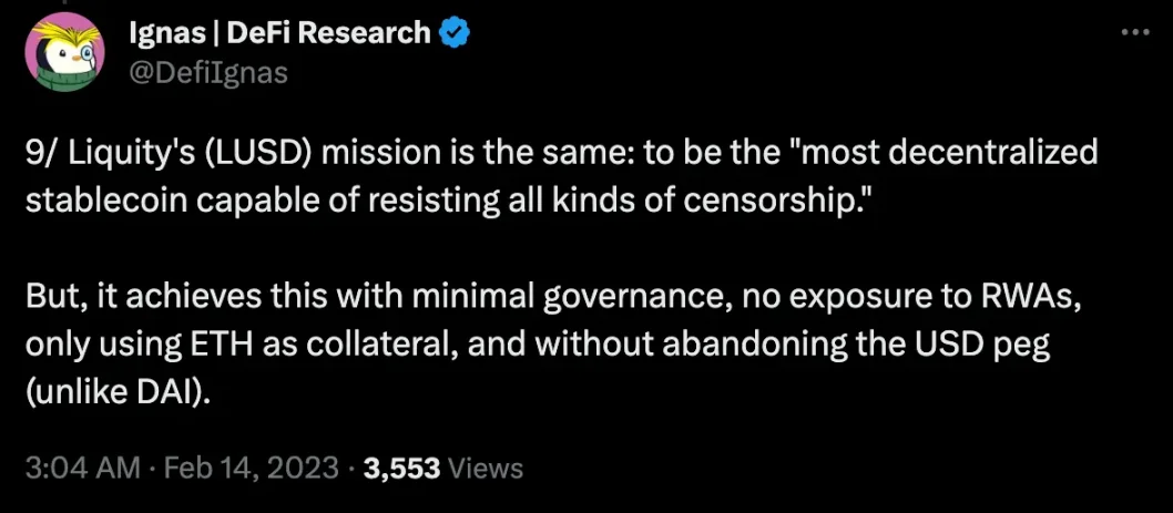 Liquity 最初是作为重度治理的 DAI 的替代品。LUSD 的治理程度最低,其智能合约是不可变的(不可升级)——这对于经济安全非常有用,但对于增长来说却并不是。