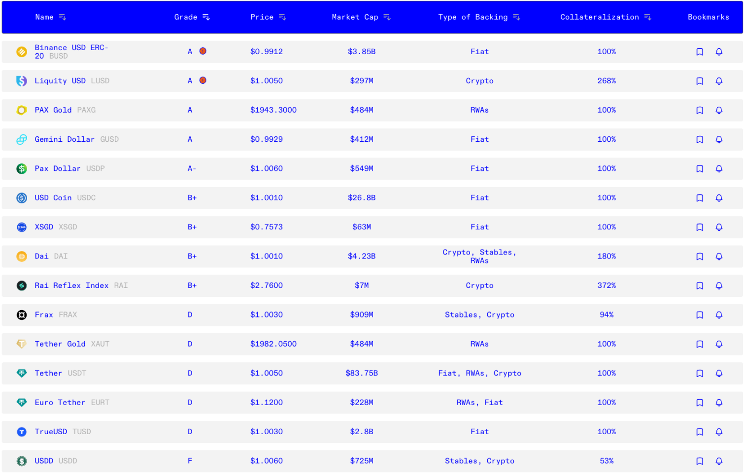 Liquity USD (评级:A):LUSD 是 Liquity Protocol 的一部分,是高度去中心化的稳定币。它由代码而不是认为控制,这是其安全性的一个体现。但请注意,智能合约和预言机也存在风险,谨慎购买价值 1 美元以上的 LUSD。
