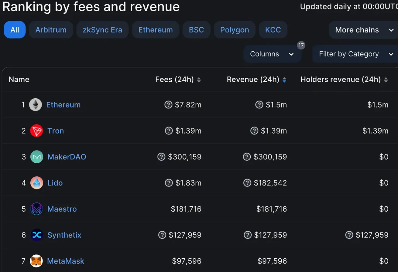 Maker 目前在创收方面排名第三:高于 Lido 、Synthetix 和 Metamask。