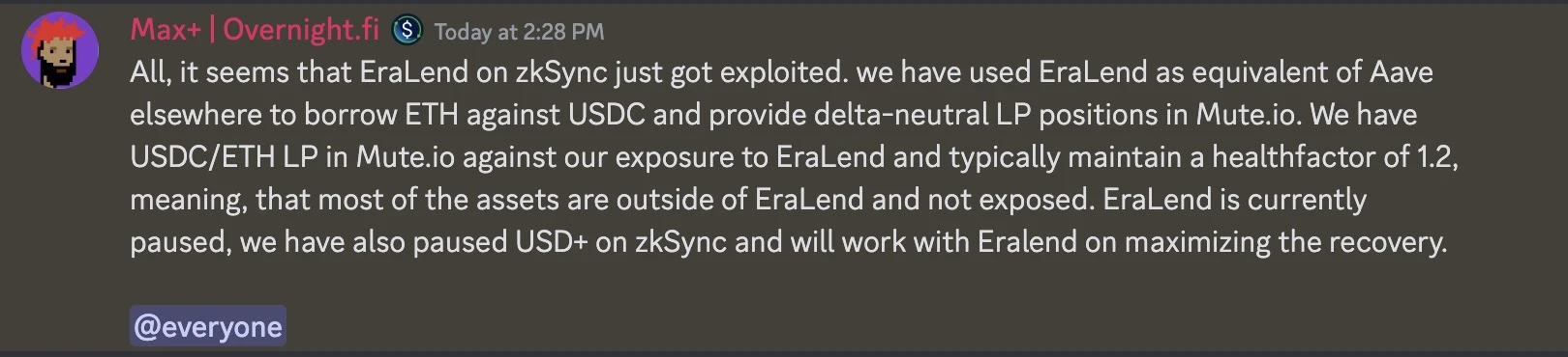 官方表示,由于该项目组 LP 贷出了大量 ETH,因此在 EraLend 上的净资产敞口并不大(官方的用词为“敞口已被抵消”)。但该项目仍然面临了一部分的稳定币损失。