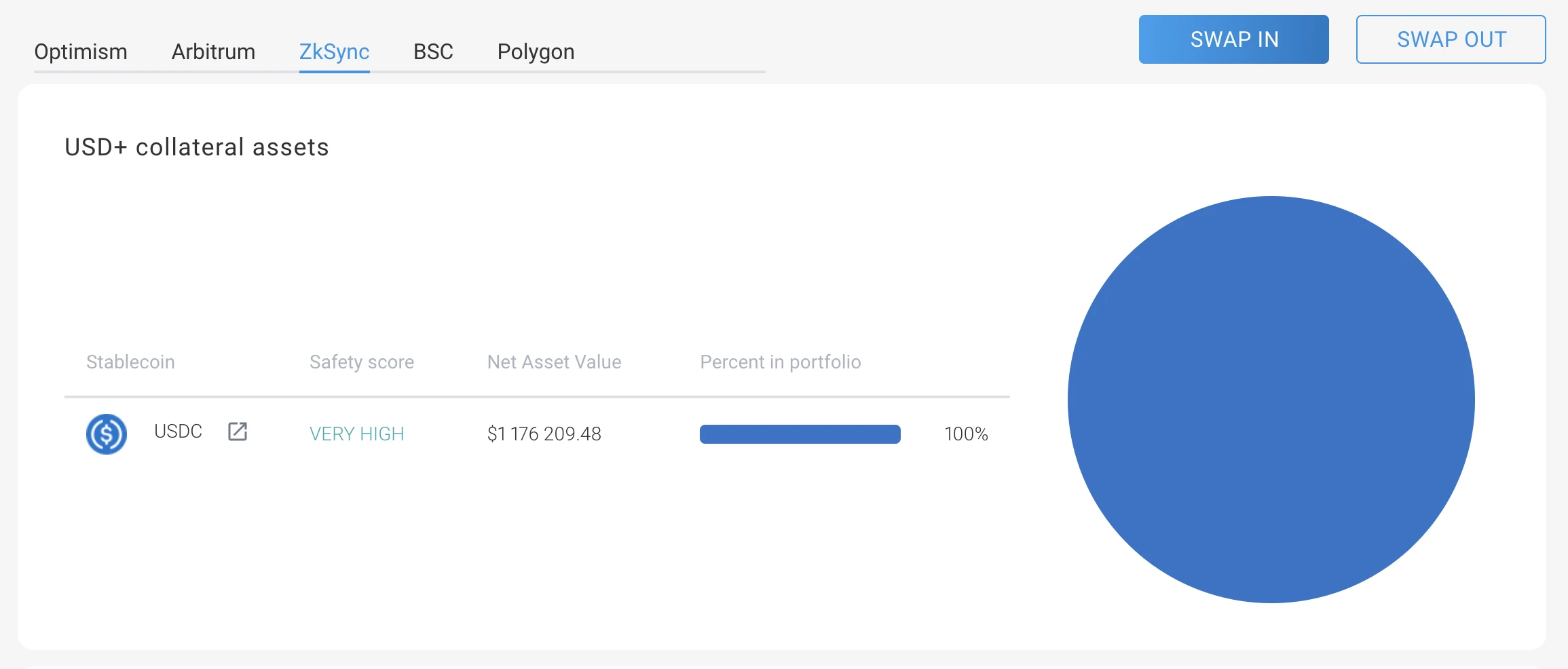 USD+是由 overnight.fi 发行的一款在 OP、Arb、zkSync 等多链均有部署的稳定币产品。与常见的稳定币依托于法币储备有所不同,该产品并不与法币直接产生联系,而是与 USDC 1: 1 挂钩。