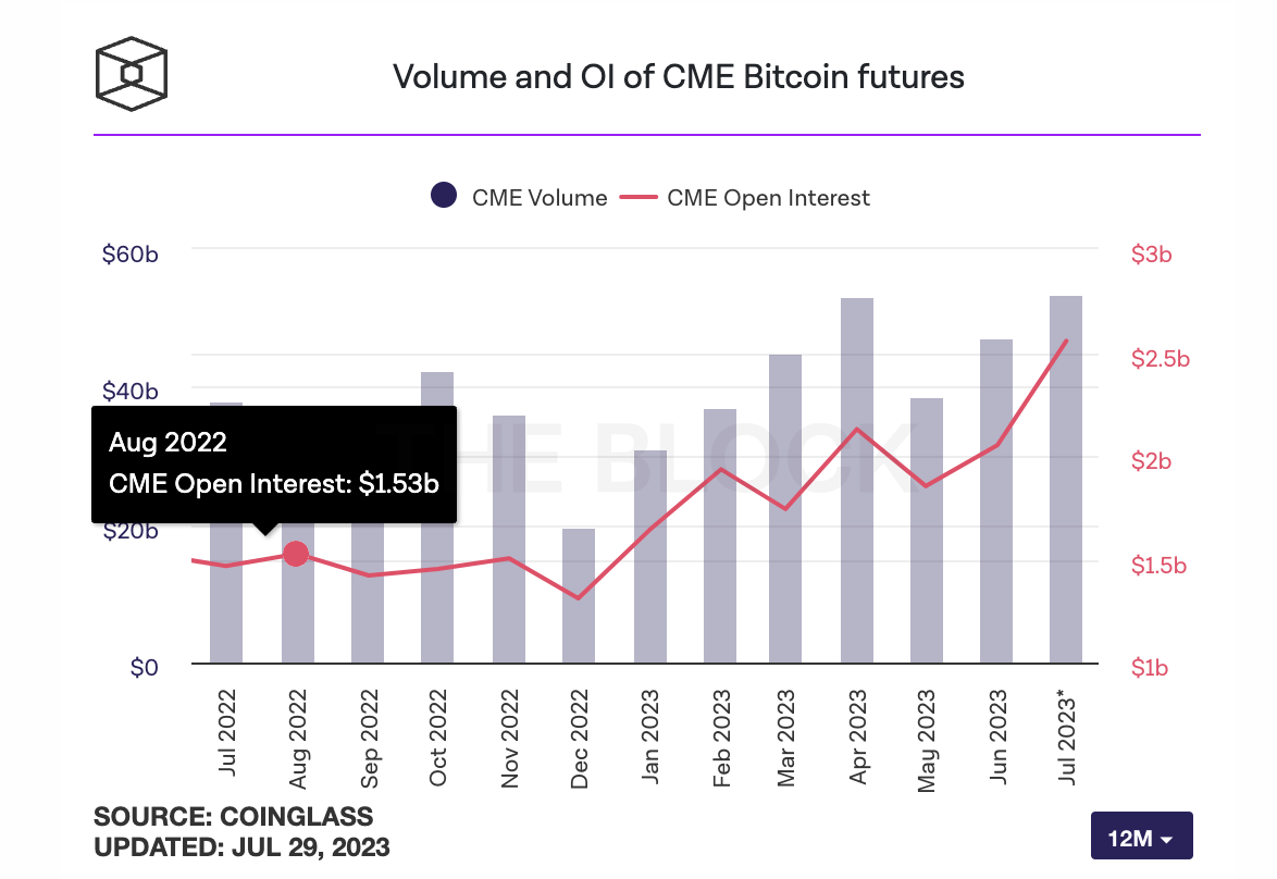 博链财经BroadChain获悉,7月29日,据The Block,数据显示,CME 比特币 期货在7月份创下了2023年以来的最高月度交易量。