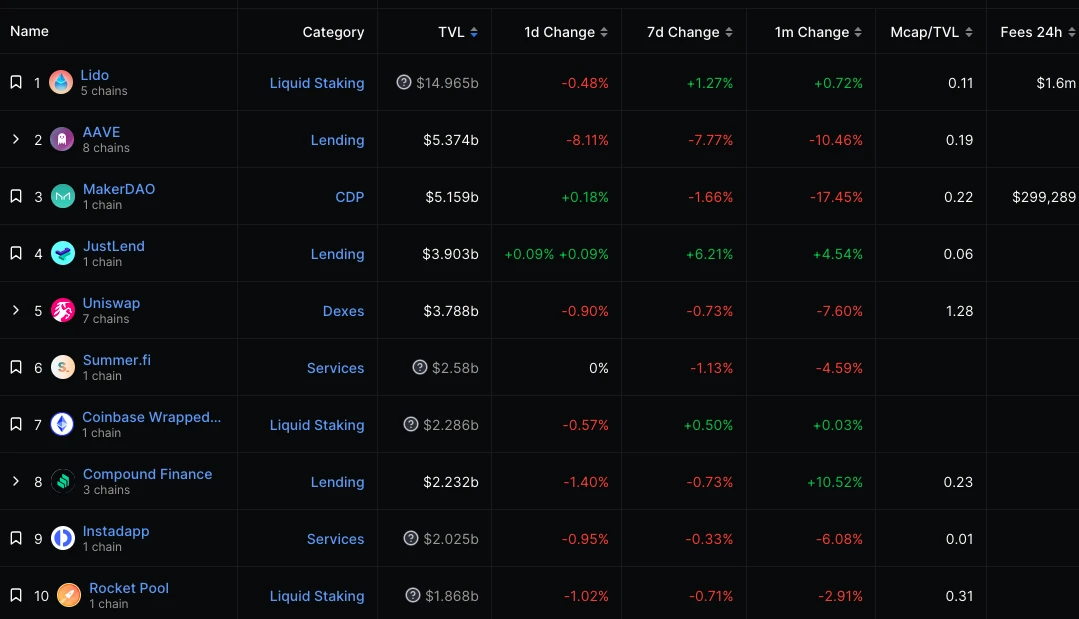 DeFiLlama 数据显示,上周链上锁仓抵押品价值从 253.5 亿美元下降至 230.7 亿美元,环比下降 9.8% 。从单个项目来看,锁仓价值前三名分别是: Lido 149.6 亿美元; Aave 53.7 亿美元; MakerDAO 51.5 亿美元。