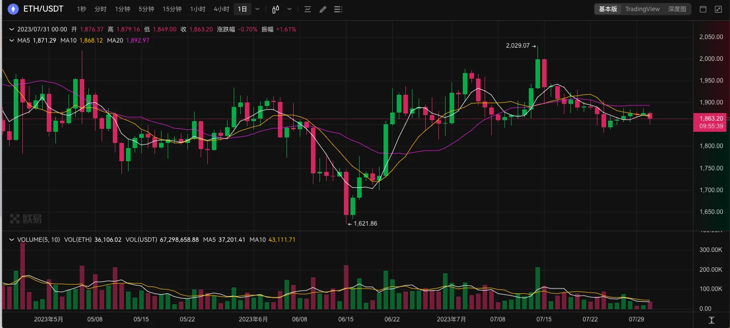 OKX 行情数据显示,上周 ETH 窄幅震荡,周内收于 1876 美元,环比微涨不到 1%