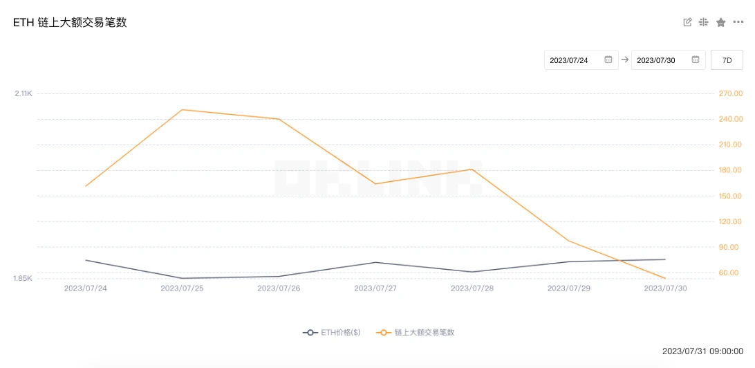 欧科云链 OKlink 数据 显示,上周链上大额交易笔数达到 1147 ,相较于前一周(1446)环比下降 20% ,巨鲸交易热情明显下降。