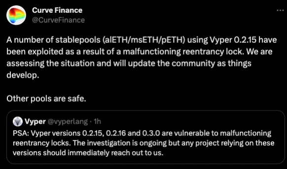 但是,本次漏洞的影响已经发生了。Curve 团队紧接着在一分钟之后发推说,一些使用了 Vyper 0.2.15 版本的稳定池,包括 alETH、msETH 以及 pETH,因为重入锁功能的失效,已经遭受了网络攻击。这一漏洞允许攻击者在单次交易中多次执行某些功能,可能对相关区块链项目造成重大损失。