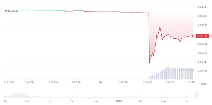数个项目受到了影响。根据链上数据监测方 Supremacy Alert 显示,NFT 质押协议 JPEG ’d 受到了该重入漏洞的影响,目前被盗的资产达到了 1000 万美元左右。紧接着,另两个链上安全账号派盾和 Hexagate 也发推@了 JPEG‘d 项目方,声称该交易为黑客交易。这一事件导致 JPEG‘d 的代币价值跳水,从稳定在 0.00062 左右跌至 0.0003 ,现回升至 0.00049 ,单日跌幅达到 21.63% 。