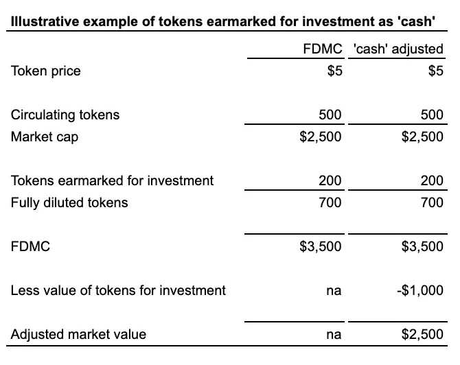 下表机械地概述了这个逻辑。下表中的示例概述了一个流通 500 代币的协议。额外发行 200 个代币给储备金。这 200 个代币被指定用于投资网络。以 5 美元的代币价格,市值和完全稀释市值分别为 2, 500 美元和 3, 500 美元。储备金中的 200 个被指定用于投资的代币价值为 1, 000 美元。这 1, 000 美元的价值应该减少协议的总价值,就像现金减少了公司的企业价值一样。