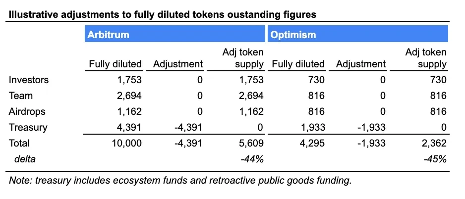 下表说明了应对 Arbitrum 和 Optimism 代币流通进行的调整。调整后的代币供应量比全面稀释数字低 45% 。