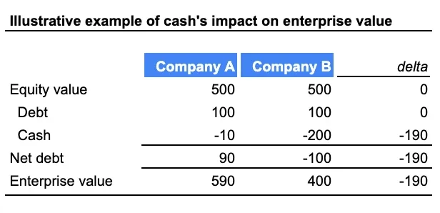 用于将来投资的代币相当于公司资产负债表上的现金。资产负债表上的现金会降低公司的总价值。公司的总价值是企业价值。企业价值反映了公司所有资产的价值。企业价值的一部分是公司的股权价值。对于上市公司来说,股权价值就是其市值。另一部分是净债务。净债务是总债务减去现金。这个概念是公司的总资产由股权和净债务资助。下表说明了在其他条件相同的情况下,增加现金如何降低公司的企业价值。