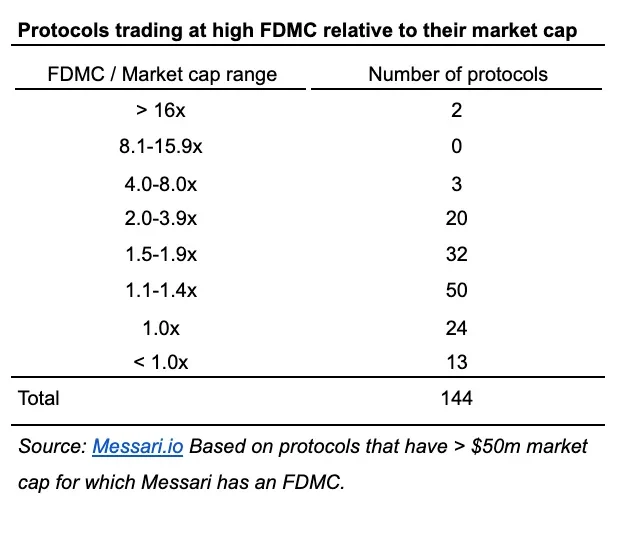 如今,高完全稀释市值和低市值的资产已经不那么普遍了。但它们仍然存在。下表列出了完全稀释市值与市值之间的倍数关系的协议数量。