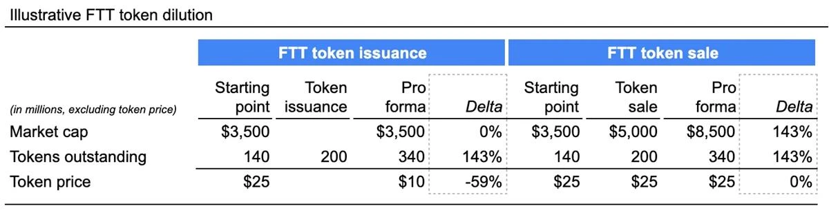 或者,如果这 2 亿枚 FTT 代币以当时的 25 美元的代币价格出售,那么 FTT 将获得 50 亿美元的收入,将市值增加到 85 亿美元的完全稀释市值。流通代币数量将增加到 3.4 亿枚。市值和流通代币数量都增加了 143% 。最终结果是每个代币的价格没有变化。