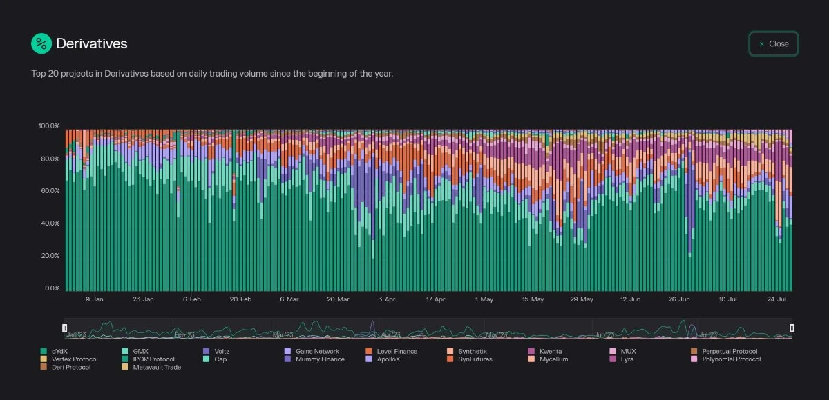 仅今年一年,衍生品交易量就超过 4000 亿美元,其中 44% 来自 dYdX 。即将推出的 dYdX v4 有助于说明应用链理论所拥有的巨大力量。(注:应用链理论是随着每一个建立在区块链上的协议想要扩展,他们将寻求转变为主权链,使他们完全控制他们的协议,而不依赖原有的 L1。)